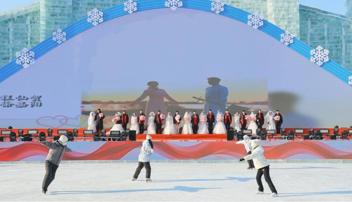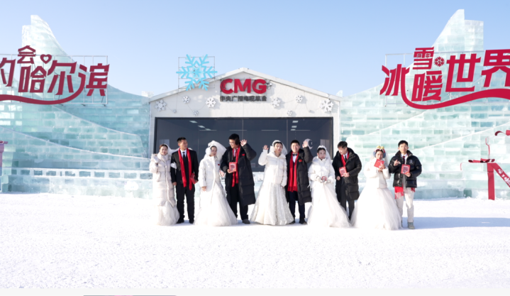 活动现场,记者邀请新人走进中央广播电视总台冰雪演播室,新人们不仅纷纷拍照留念,还分享了他们的爱情故事,同时也收获了一份“尔滨”礼物。