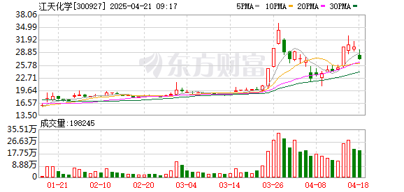 消息面上,江天化学2024年业绩预告称,预计2024年归属于上市公司股东的净利润2.76亿元—3.58亿元,同比增长302.64%—422.27%。
